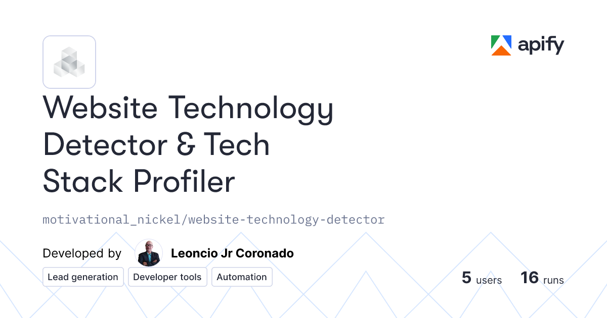 Website Technology Detector & Tech Stack ProfilerIdentifies CMS, frameworks, JavaScript libraries, analytics tools, CDN signatures, SEO tags, cookies, and header-level technology fingerprints. Useful for lead generation, audits, and competitor research.https://apify.com/motivational_nickel/website-technology-detector